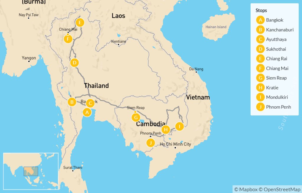 Map of Ultimate Culture, History & Nature in Thailand & Cambodia – 21 Days