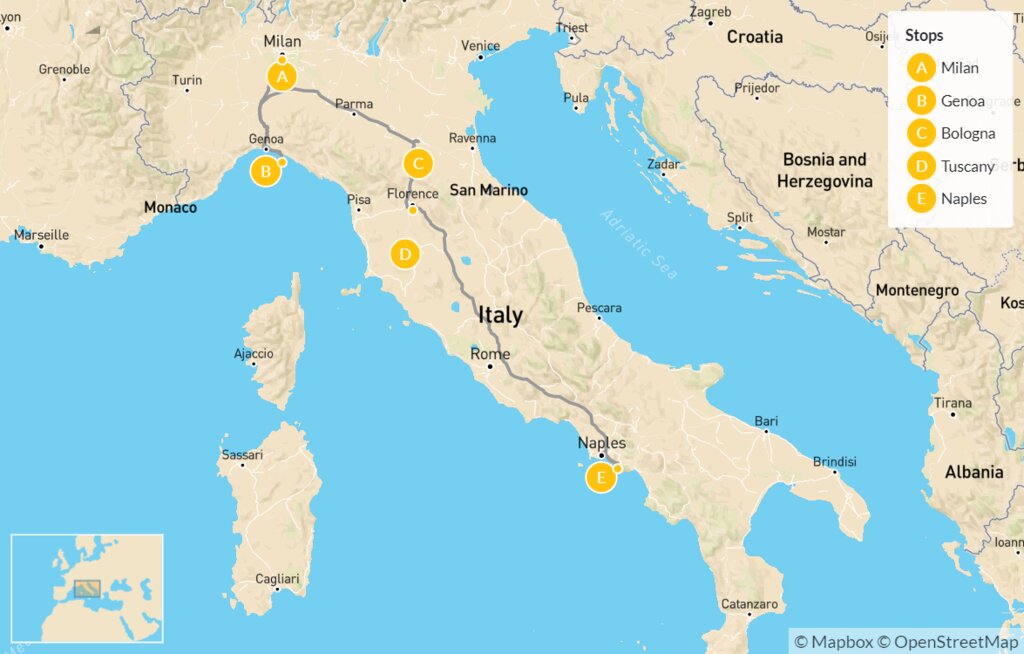 Map of Ultimate Italy for Foodies: Genoa, Bologna, Tuscany & Naples – 13 Days