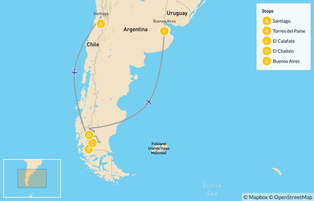 Map of Ultimate Luxury Exploration of Patagonia: Chile to Argentina – 10 Days