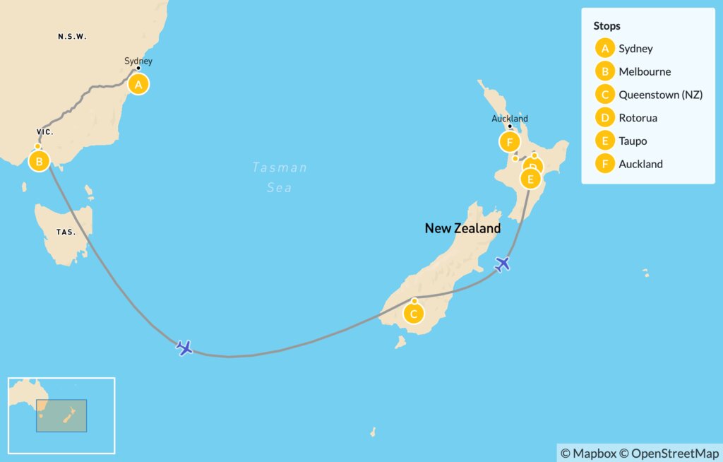Map of Ultimate New Zealand & Australia Adventure – 15 Days