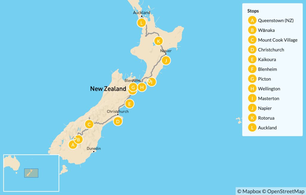 Embark on a 13-day whirlwind tour of New Zealand’s North and South Islands as you follow the east coast. Begin in Queenstown, a southern city known for extreme adventure sports, then make your way up as you visit wine regions like Wanaka and Kaikoura and see glaciers in Aoraki / Mount Cook. Take a ferry to North Island, stopping in Wellington, the capital, before visiting volcanic landscapes and Maori villages in Rotorua. The tour finishes with a tour of Waitomo Caves and Auckland, the country’s largest city.
