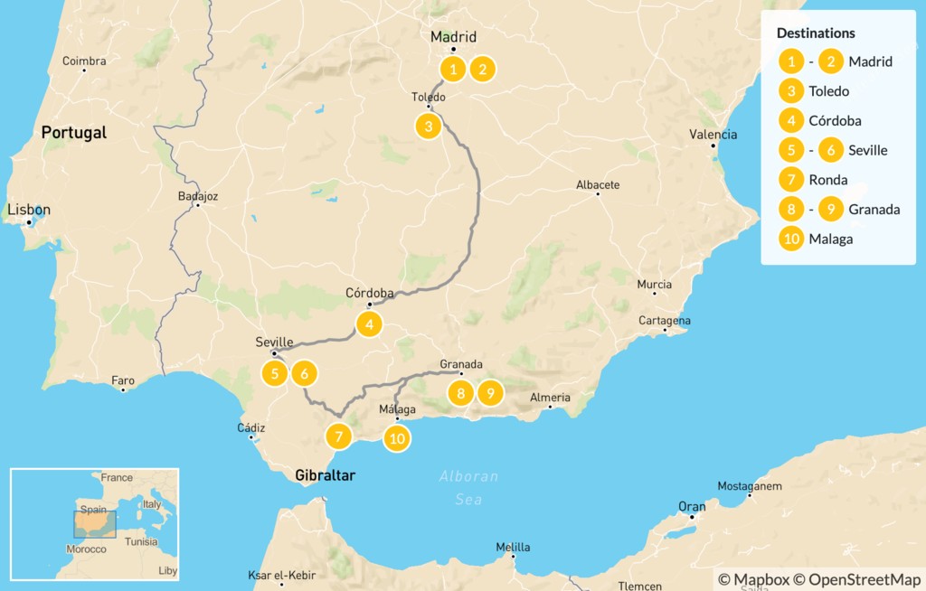 Map of Ultimate Southern Spain Road Trip: Madrid to Andalusia – 11 days