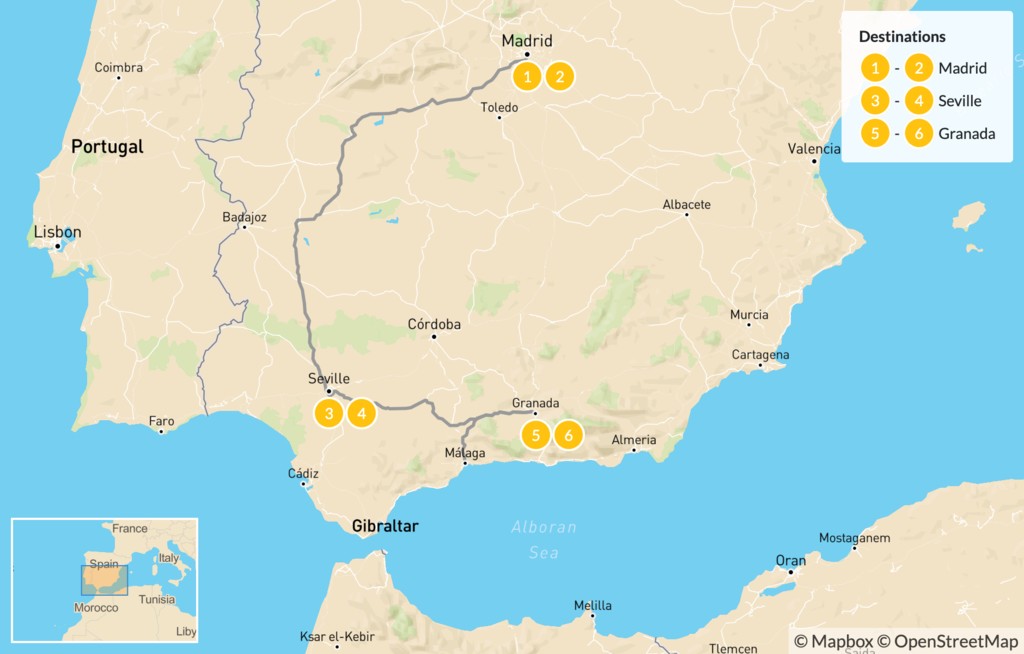 Map of Ultimate Southern Spain Road Trip: Madrid to Andalusia – 7 days