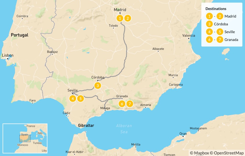 In a little over a week, you can embark on the road trip of a lifetime through Spain. After enjoying a city tour in Madrid, you’ll pick up your car and hit the road south to Andalusia, stopping at the ancient Roman city of Córdoba. From there, you’ll visit Andalusia’s capital of Seville, with its famous Gothic cathedral and Islamic architecture, before the trip culminates in the coastal city of Málaga.