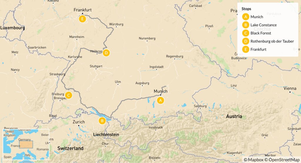 The day has come to say goodbye to Southern Germany! Depending on your departure, you might want to stroll through Frankfurt’s Old Town or visit the Museum Embankment, a strip of museums alongside the Main River. At the appropriate time, drive to the airport and return your rental car. Safe travels!