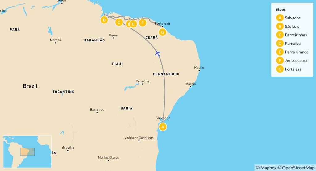 Map of Ultimate Tour of Coastal Brazil: Salvador to Jericoacoara – 12 Days