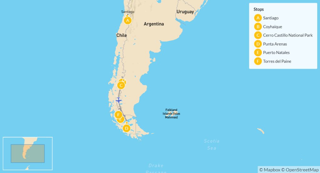 Map of Ultimate Trekking Adventure in Chilean Patagonia – 15 Days