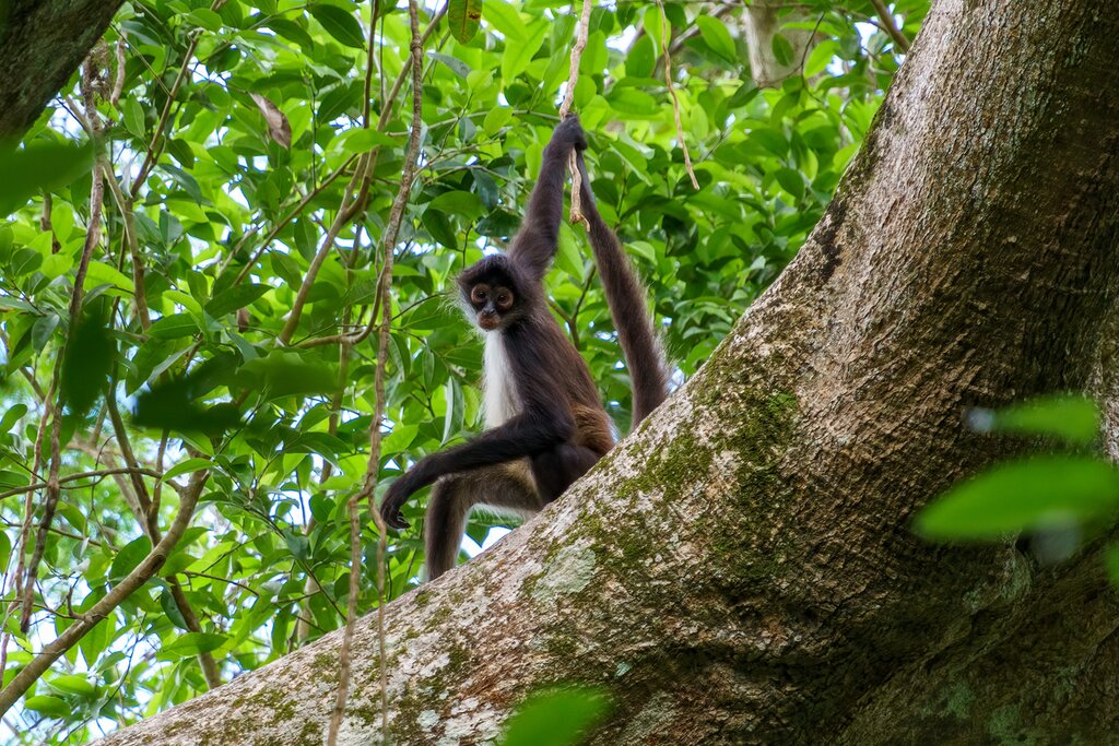 Finally, you’ll arrive at the archaeological zone. Here, you’ll visit the highest pyramid of the site, which towers 147 feet (45 m) high above the forest. Climb to the top to enjoy the incredible views of the jungle in a sea of green comprised of trees that go on forever. At the top, you can hear the noises of the jungle: trills and hums, spider monkeys moving branches as they move, or woodpeckers playing their wooden melody in search of insects.