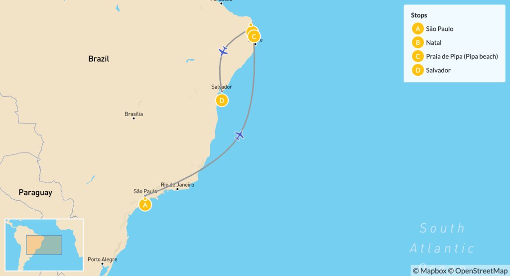 Map of Uncover Brazil’s Coastal Cities & Towns: São Paulo, Natal, Praia de Pipa & Salvador – 9 Days