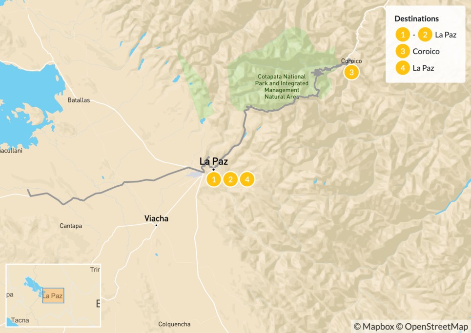 From a cable car ride high above La Paz to a bike ride on the infamous Death Road, this invigorating five-day trip is packed with adventures. The itinerary focuses on the most exciting experiences in and around Bolivia’s capital city. Start your trip with sightseeing at the UNESCO-listed ruins of Tiwanaku, then hurtle downhill through the Yungas cloud forest on a cycling tour. You’ll visit an Afro-Bolivian community to learn about coca leaf farming before returning to the city to sample traditional Andean cuisine.