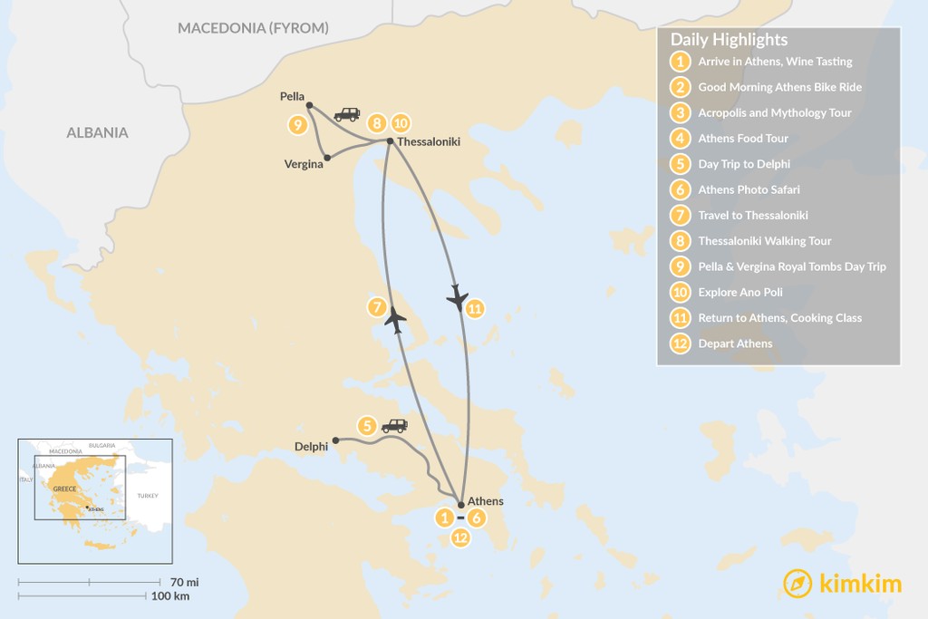 Map of Urban Adventures and History in Athens & Thessaloniki – 12 Days