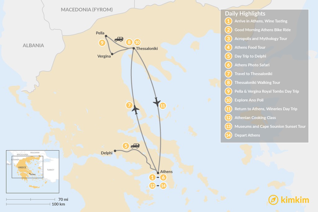 Map of Urban Adventures and History in Athens & Thessaloniki – 14 Days