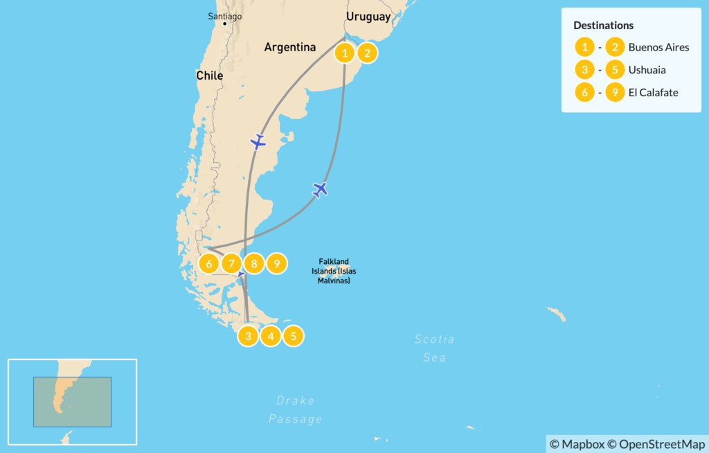 Map of Ushuaia & El Calafate Adventure – 10 Days