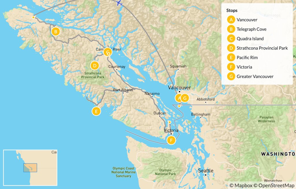 Explore the diverse landscapes of Vancouver Island, where you can easily spend days hiking through the backcountry, paddling endless coastlines, or relaxing at cozy retreats next to the beach. You’ll pass through prime wildlife viewing habitats and have plenty of hiking, biking, and sea kayaking opportunities. This is a great route for those looking to experience all that Vancouver Island has to offer without feeling rushed.
