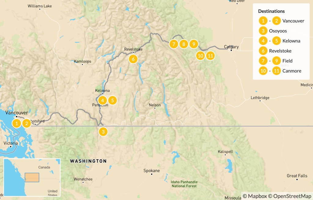 Map of Vancouver to Calgary Road Trip: Okanagan Valley & Canadian Rockies – 12 Days