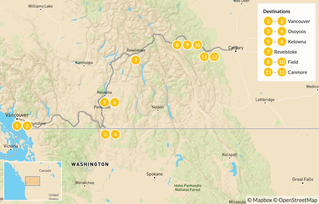 Map of Vancouver to Calgary Road Trip: Okanagan Valley & Canadian Rockies – 13 Days