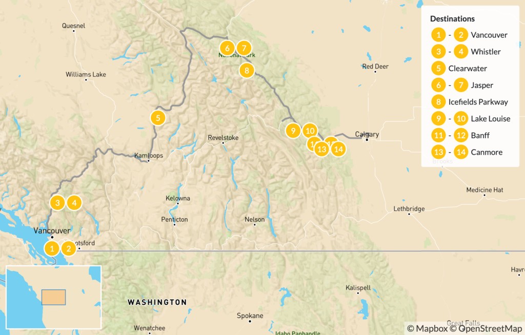 Map of Vancouver to Calgary: Whistler, Wells Gray, & the Canadian Rockies – 15 Days