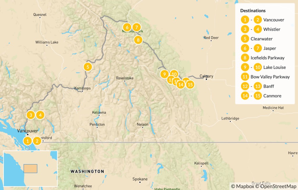 Map of Vancouver to Calgary: Whistler, Wells Gray & the Canadian Rockies – 16 Days