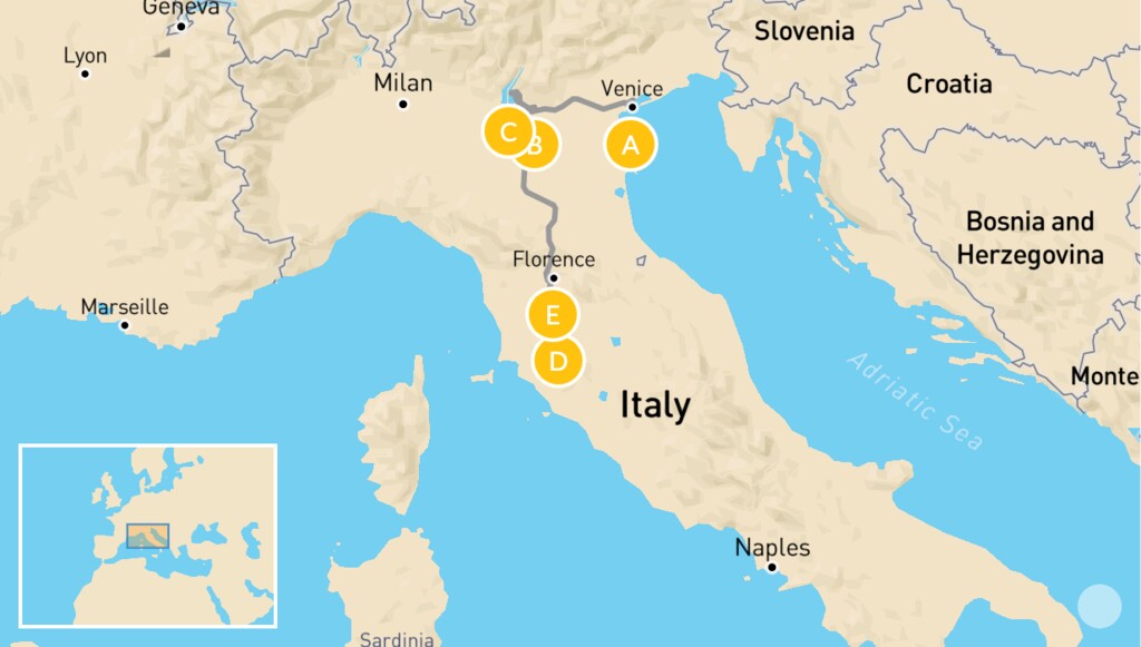 Map of Veneto and Tuscany for Active Families: Venice, Verona, Lake Garda, Siena & Florence – 14 Days