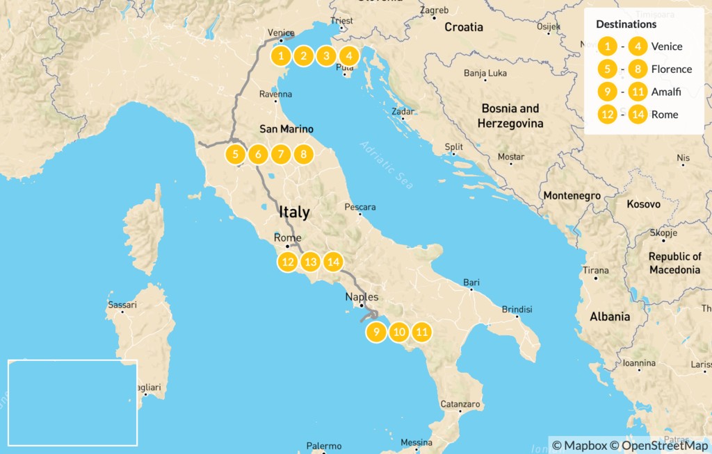 Map of Venice, Florence, Amalfi Coast & Rome – 15 Days