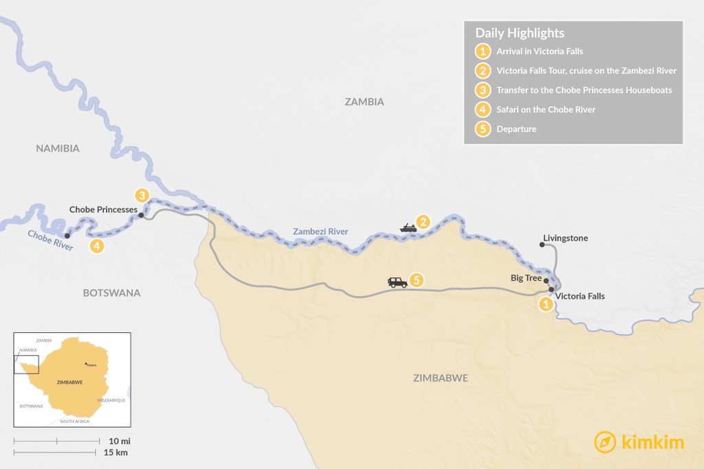 Map of Victoria Falls & Chobe River Houseboat – 5 Days