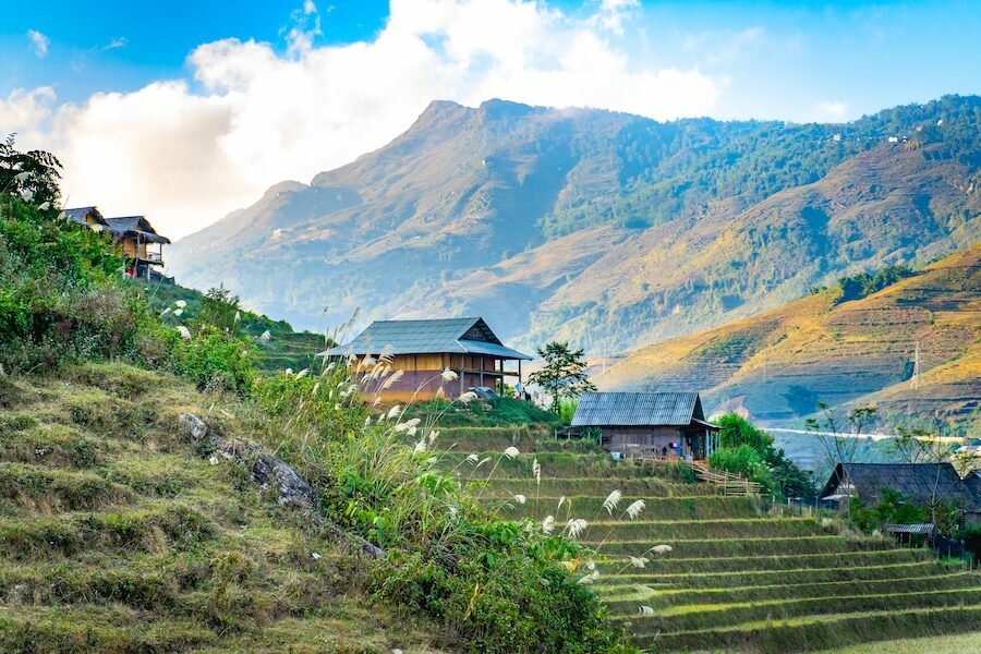 In the morning, you’ll leave on a full-day tour to some isolated rural villages on the outskirts of Sapa. It begins with a 5-mile (8 km) drive to the O Quy Ho Mountain Pass in the Hoang Lien Son mountain range, where you’ll stop to admire the views of towering Mount Fansipan and the verdant Sin Chai Valley. From there, you’ll pass forests and waterfalls as you make your way to Ban Khoang, a village home to the Black Hmong and Red Dao ethnic groups.