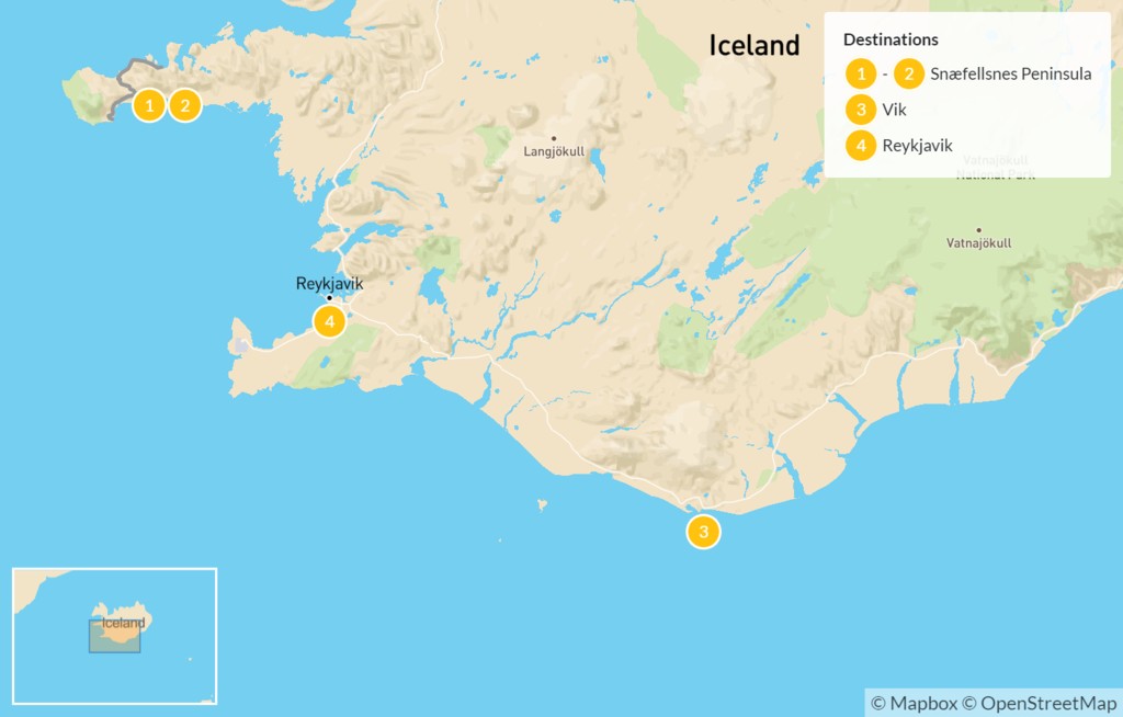 Map of Volcanic Snaefellsnes Peninsula & South Coast Highlights – 5 Days