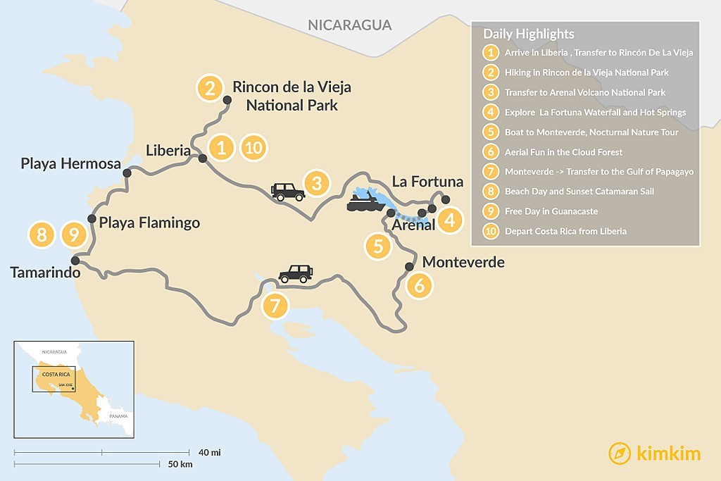 Map of Volcanoes, Cloud Forests, and the Pacific Coast – 10 Days