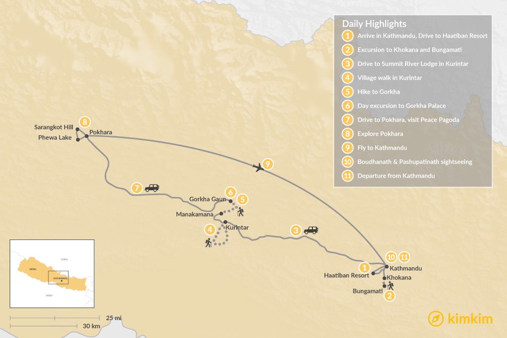 Grab your camera and backpack for another full day of hiking! Start at the Gorkha Bazaar and take the steps upward to the ancient palace and remains of an old fort. From there, make your way to Bajra Bairab Temple for views over the northern hills and a panorama of the Himalayas, with Langtang in the east and the Annapurna massif in the west. Once you’ve soaked it all in, make your way make to Gorkha Village, stopping at historic sites and in traditional villages like Ale Bhanjang and Panche Swara. End the day with a beautiful sunset from Gorkha Gaun.