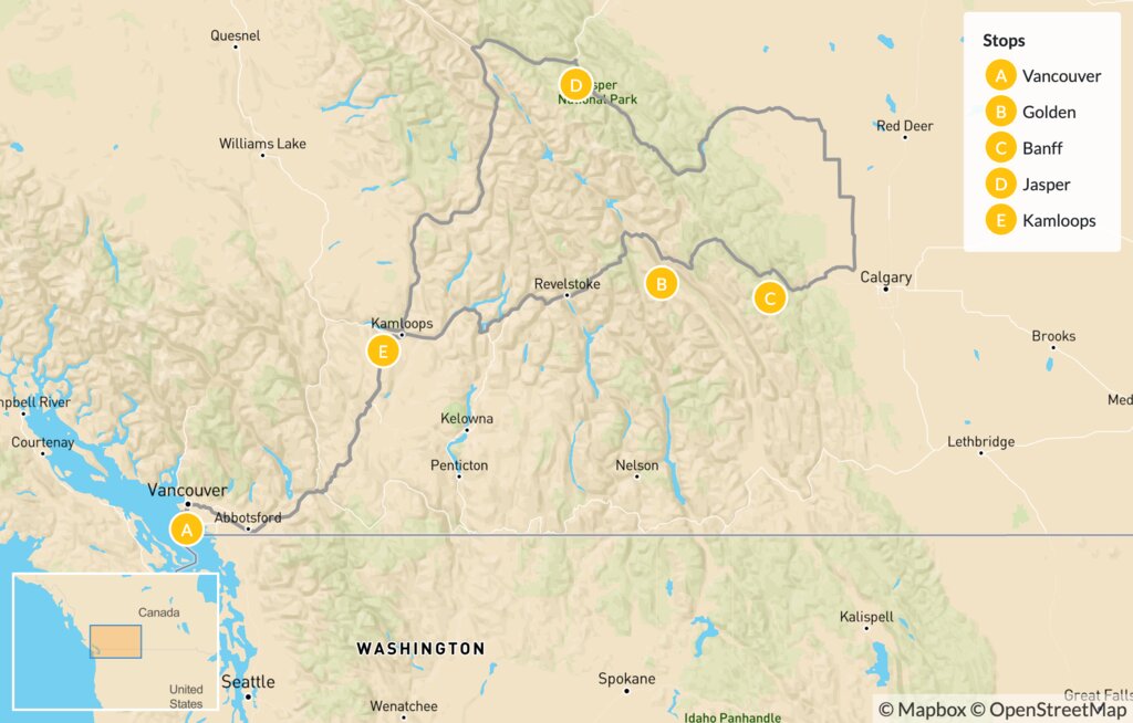 Map of Western Canada Circuit From Vancouver to Banff: Food, Mountains, Lakes & Wildlife – 8 Days