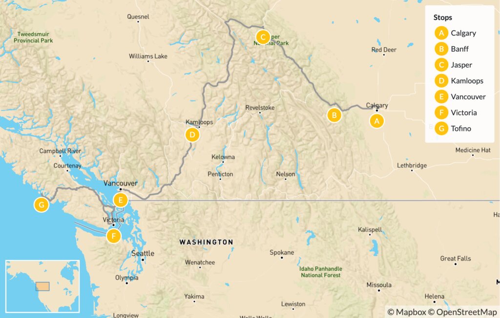 Map of Western Canada Road Trip: From the Rockies to the Pacific – 14 Days