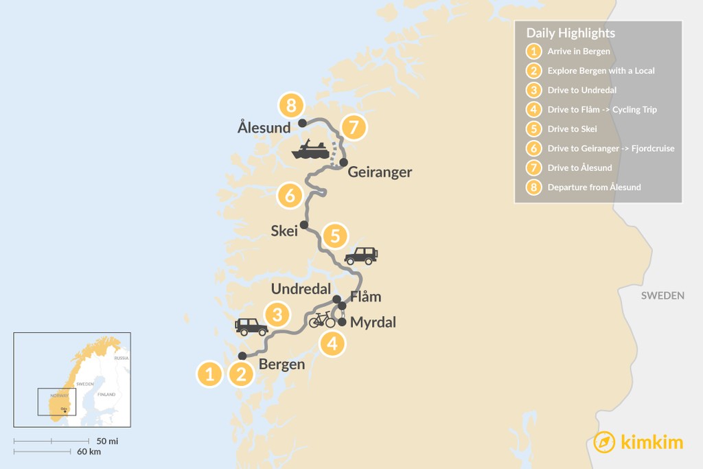Today, you’ll drive to the village of Flåm where you will park your car and pick up your bicycle rental for the day. Bring your two wheels onboard the Flåm Railway and slowly start on your way up to Myrdal, a beautiful journey along one of the world’s most scenic (and steep) train rides!