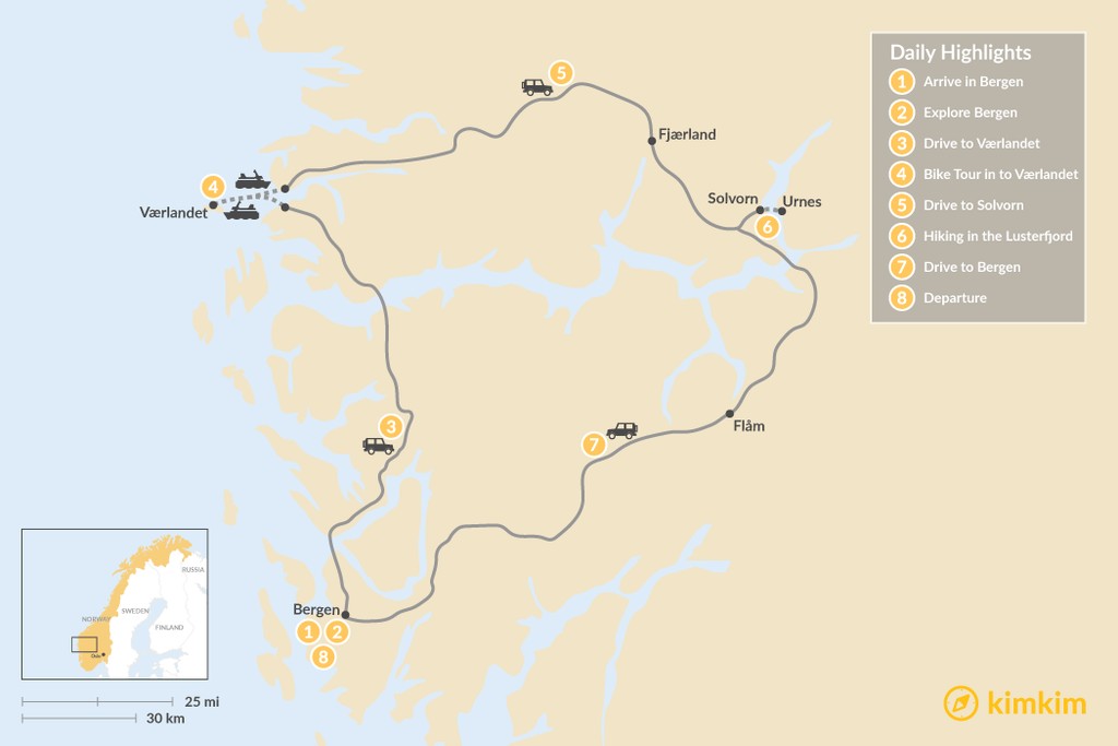 After breakfast in Bergen, pick up a rental car and begin your drive northward to the coastal island of Værlandet. This 120-mile (190 km) drive takes approximately 4.5 hours and includes a car ferry where you can get out and stretch your legs.