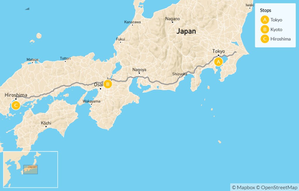 Map of Whirlwind City Tour of Japan: Tokyo, Kyoto & Hiroshima – 7 Days