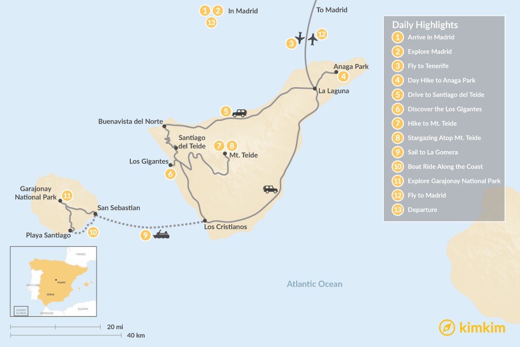 Map of Wild Canary Islands: Madrid, Tenerife & La Gomera – 13 Days