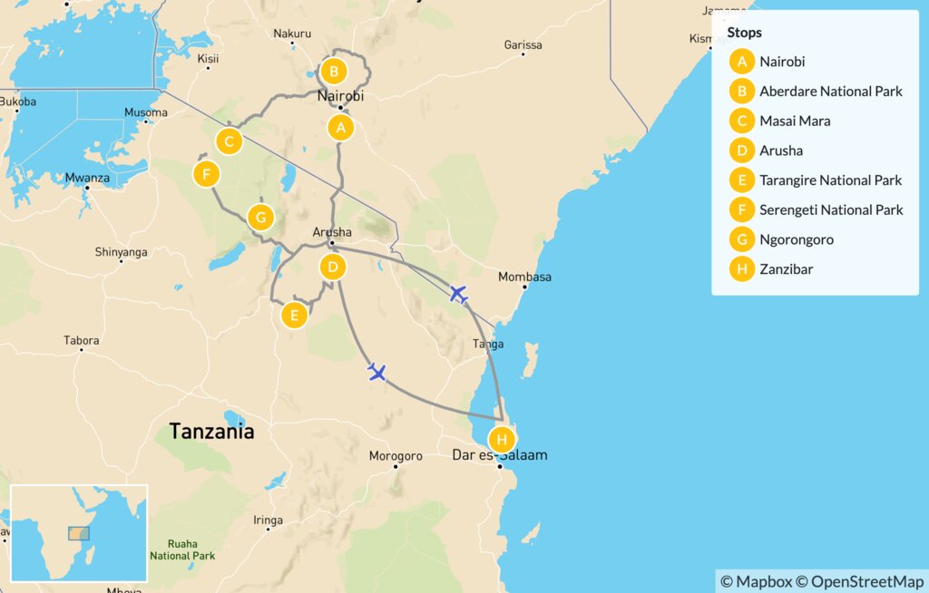 Map of Wild East African Odyssey: Savannas & Beaches in Kenya & Tanzania – 21 Days