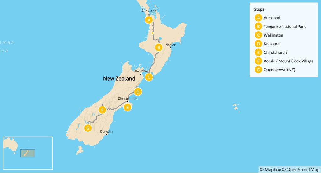 Map of Wild New Zealand: Auckland, Tongariro, Wellington, Kaikoura, Christchurch, Mount Cook & Queenstown – 16 Days