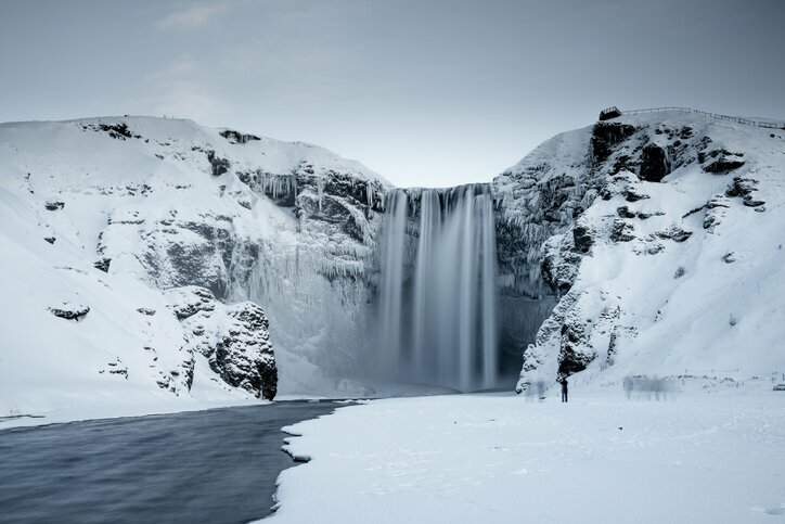 Tour the South Coast today, visiting some of Iceland’s most iconic waterfalls and natural landmarks. Your first stop is Urriðafoss waterfall, located on the Þjórsá River. This is the most voluminous waterfall in the country, where the river drops down to the edge of the Þjórsárhraun lava field to create a breathtaking display. From there, head to Seljarlandsfoss, the only known waterfall of its kind that allows you to actually walk behind it. Stop at Gljúfrabúi falls, which tumbles down from the Gljúfurá River, as well as Skógafoss, a 200-foot high (60 m) cascade alongside towering glaciers and frozen landscapes.
