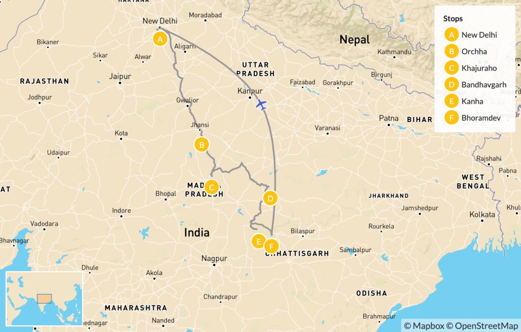 Map of Wildlife & Temples in Central India: Khajuraho, Bandhavgarh & Kanha – 13 Days