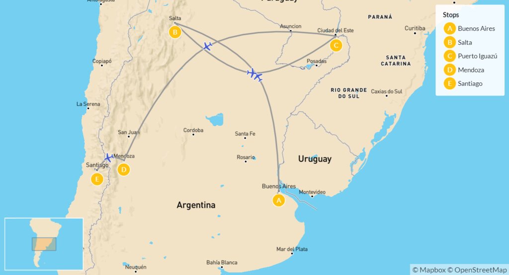 Map of Wine Country, Deserts & Mountains of Argentina & Chile – 21 Days