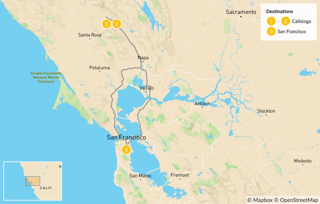 | Day 1 | San Francisco to Calistoga, via Napa Wineries | Calistoga |