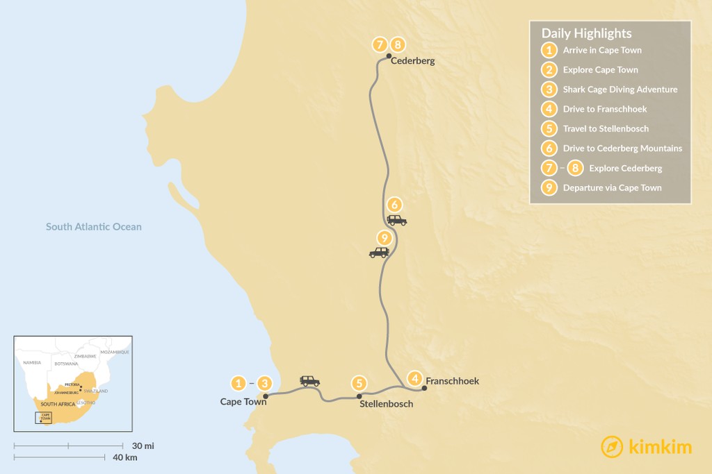 Map of Wine & Nature in South Africa: Cape Town, Winelands, & Cederberg – 9 Days
