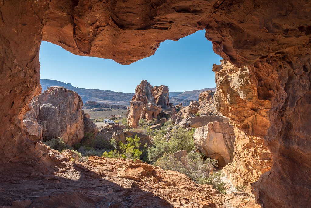 The region is characterized by dramatic landscapes, with striking sandstone formations, open plains, and ancient bush art sites that date back 10,000 years. The local sandstone, richly colored by iron oxides, has eroded into a variety of shapes. Hike or drive to see the well-known Wolfberg Arch, Stadsaal Caves, and the dramatic Maltese Cross.
