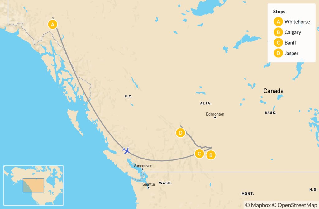 Map of Winter Adventures in Canada’s Yukon & Alberta: Whitehorse, Calgary, Banff & Jasper – 16 Days