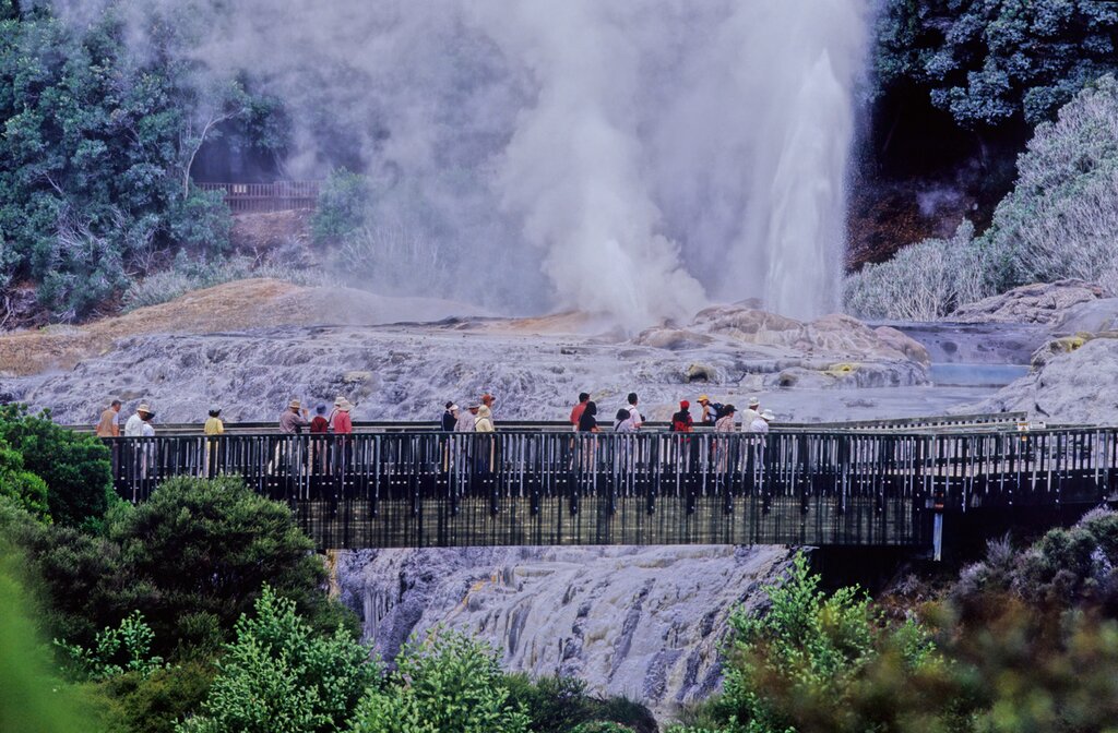 This morning, get up close with New Zealand’s national bird on a guided visit to the National Hatchery. Learn about how the organization incubates, hatches, and raises the kiwi chicks until they reach a certain size, which strongly increases their survival rate. Afterward, explore more of Rotorua’s famous geysers, bubbling mud holes, steaming vents, and sulfurous pools at Wai-O-Tapu. Choose between several different walks that showcase the distinctive landscapes and volcanic activity, including the famous Mud Pool. Learn about the Lady Knox Geyser with a guide, then watch it erupt.