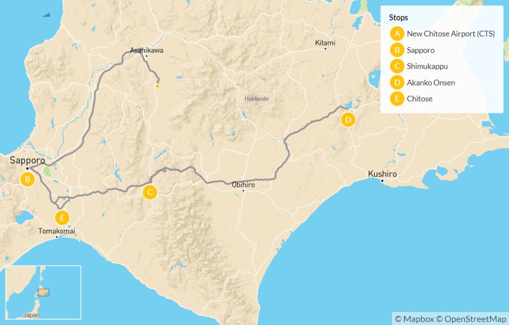Map of Winter in Japan’s Eastern Hokkaido: Skiing, Onsens & Volcanoes – 11 Days
