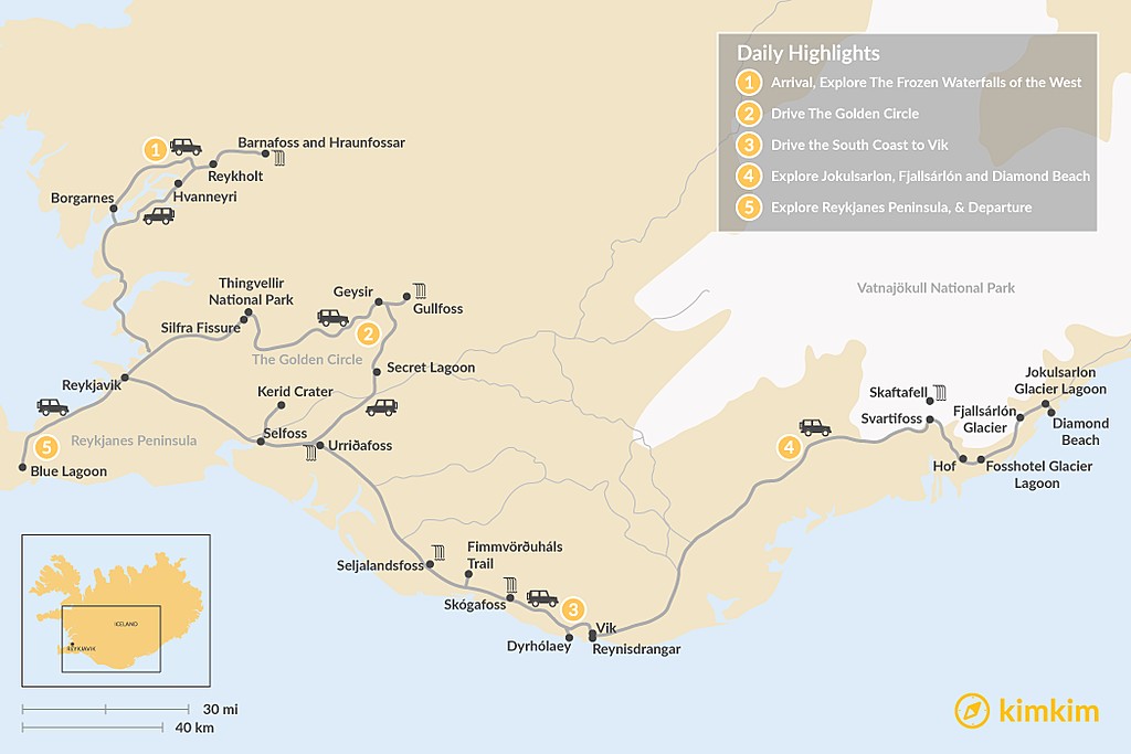 Map of Winter Self-Drive in the West, Golden Circle, & South Coast: 5 Days