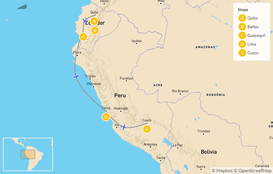 Map of Wonders of Ecuador & Peru: Quito, Baños, Guayaquil, Lima & Cusco – 11 Days