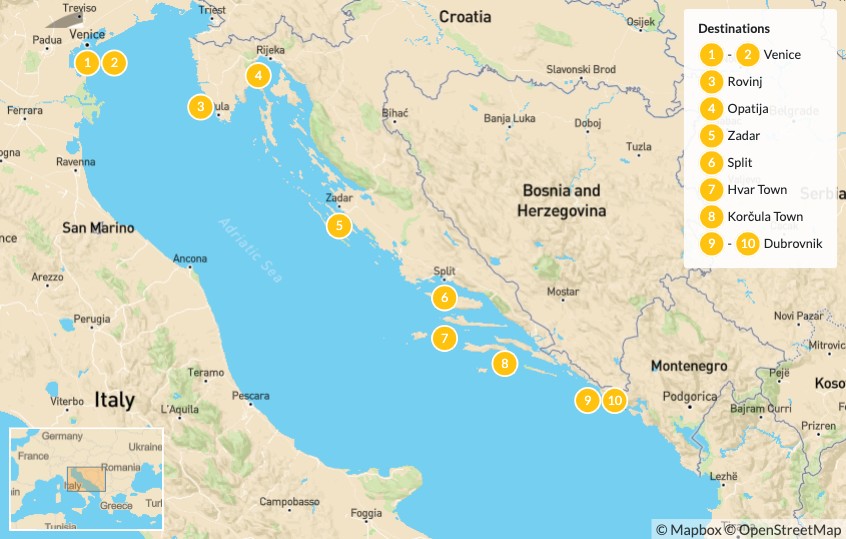 Map of Wonders of the Adriatic Coast: Venice to Dubrovnik – 11 Days
