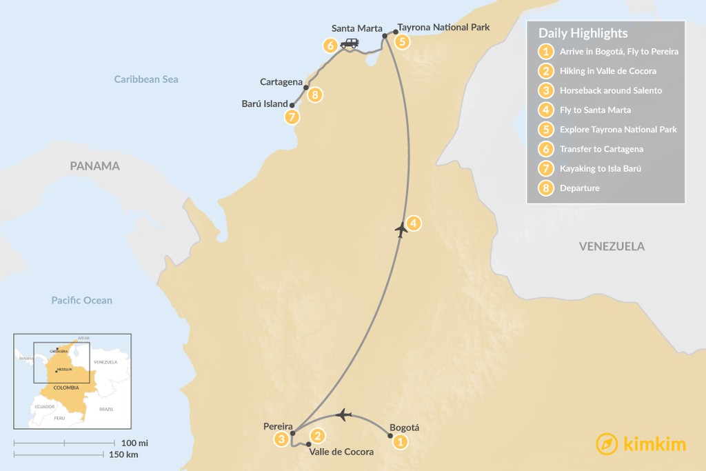 Map of Zona Cafetera and the Caribbean Coast – 8 Days